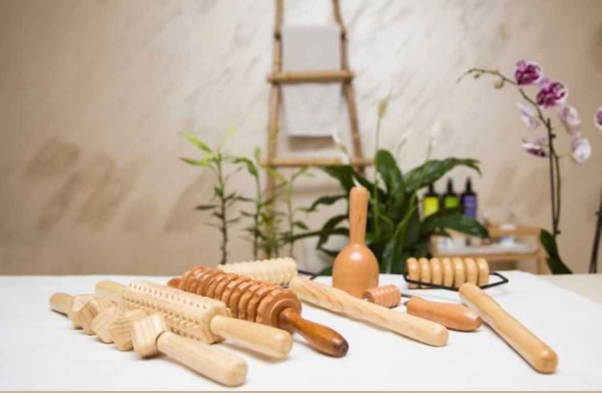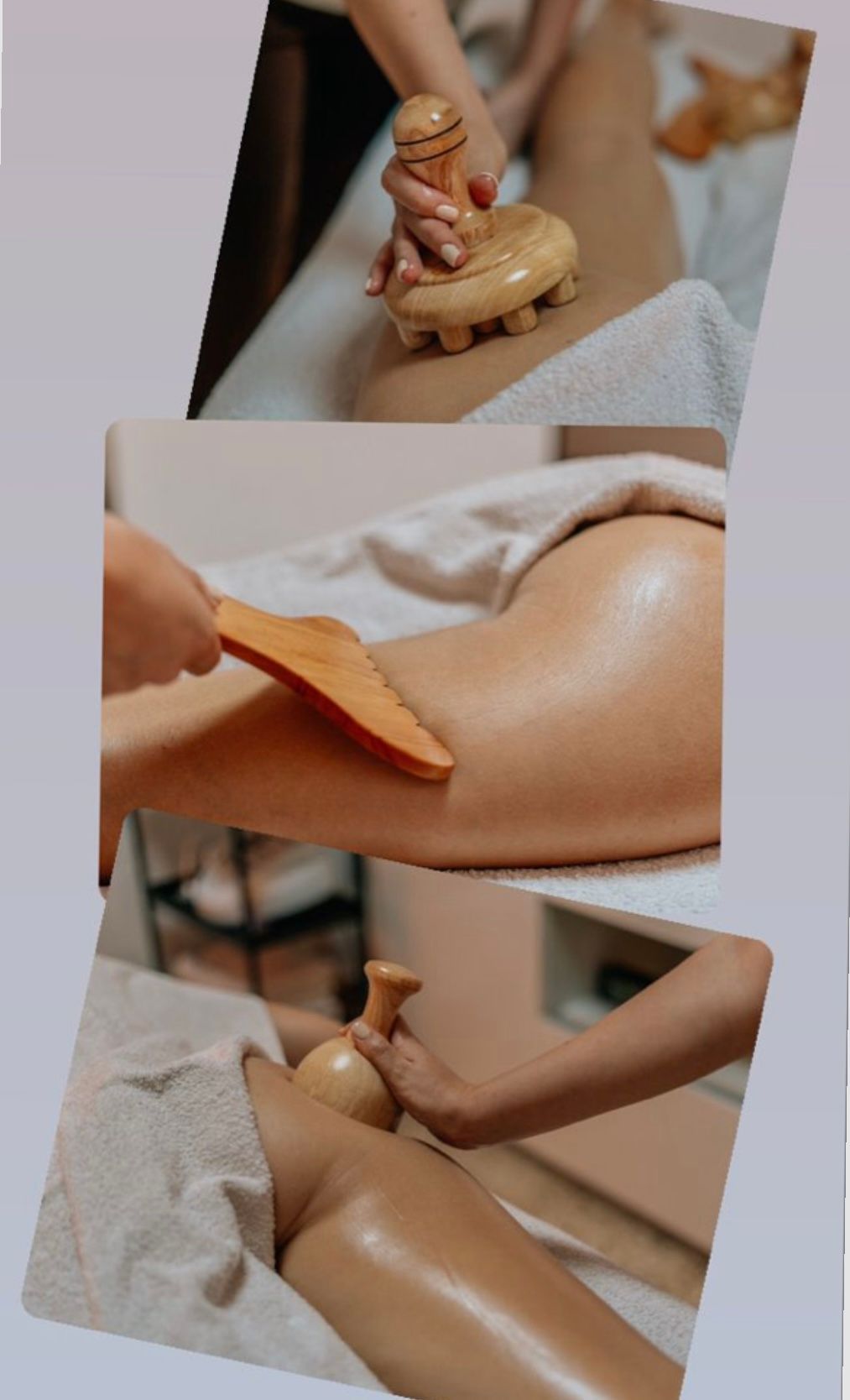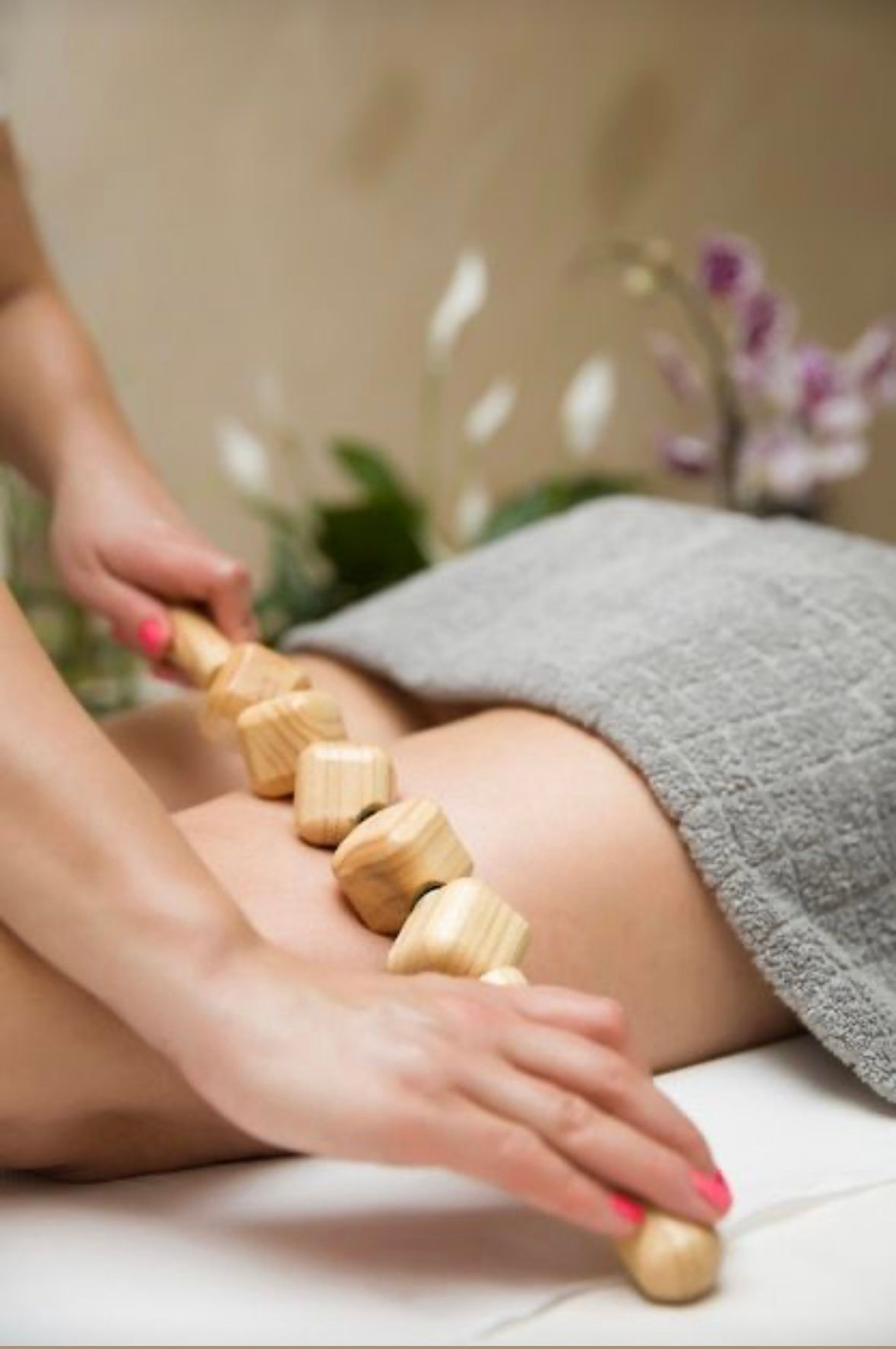 Erlebe, wie traditionelle Massage mit Holzwalzen dein Hautbild sichtbar verbessert.